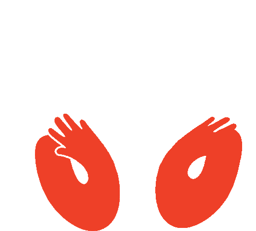 Wf Snacking character's playful red eyes with hands covering and revealing them in a peek-a-boo motion.