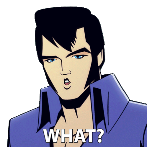 Agent Elvis Presley, voiced by Matthew McConaughey, looks confused and asks "WHAT?" in this animated sticker, expressing surprise or disbelief.
