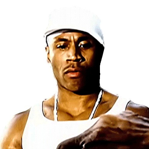 LL Cool J looks intently with a questioning expression, wearing a white tank top and cap.
