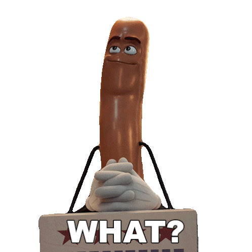 Frank, the sausage character from Sausage Party, reacts with a surprised expression behind a podium displaying "WHAT?".