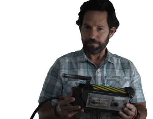 Paul Rudd as Mr. Grooberson from Ghostbusters: Afterlife looks intently, holding a P.K.E. meter with a curious expression.