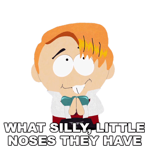 Mr. Pocket, from South Park, reacts with a curious expression, saying 'What silly, little noses they have' while touching his face.