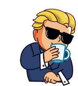 The "Stonks Guy" meme character sips from a mug, then smirks confidently.