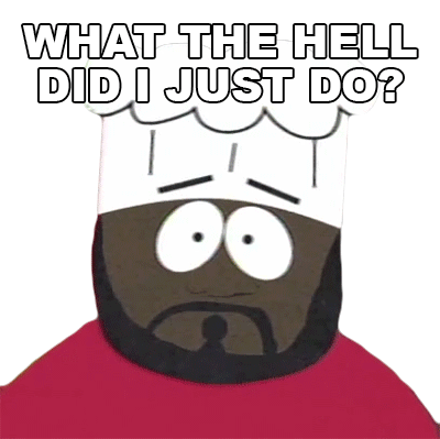 Chef from South Park, voiced by Jerome McElroy, looks shocked and asks 'What the hell did I just do?'