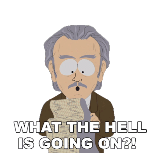Dr. Chinstrap from South Park exclaims 'What The Hell Is Going On?!' in this animated sticker.