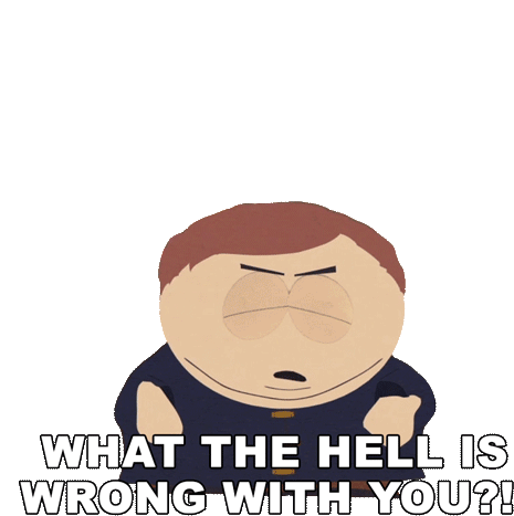 Eric Cartman from South Park angrily asks, 'What the hell is wrong with you?!' expressing frustration and disbelief.