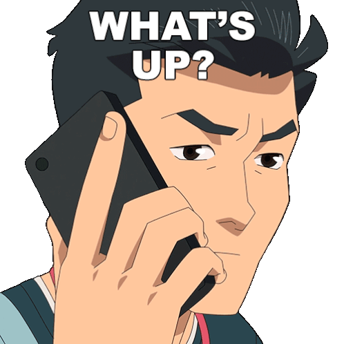 Mark Grayson from Invincible on a phone call, asking 'What's Up?' with a slightly confused expression.
