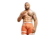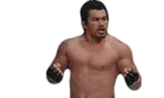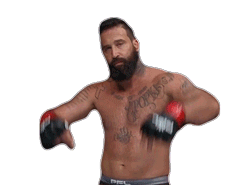 A bearded, tattooed MMA fighter flexes his biceps and points downwards, showing off his strength and confidence.