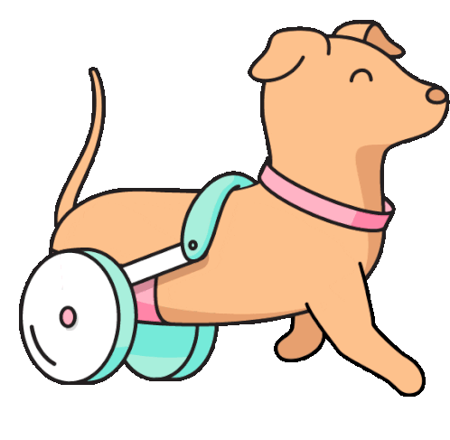 A cute and happy cartoon dog, possibly a dachshund, joyfully running with its pink and blue wheelchair.