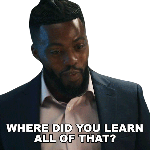 Rayful Edwin, looking surprised and curious, asks 'Where did you learn all of that?' with a slight smile.