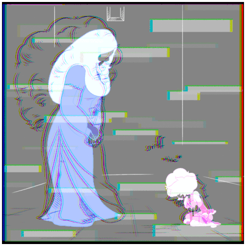 White Diamond AU comforts a crying White Steven, who sniffs and hiccups, with a subtle glitch effect adding to the emotional scene.