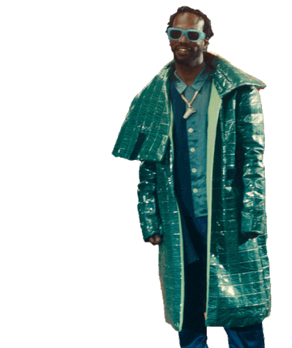 Juicy J smiles, wearing a distinctive shiny green trench coat and blue sunglasses, striking an impressive pose.