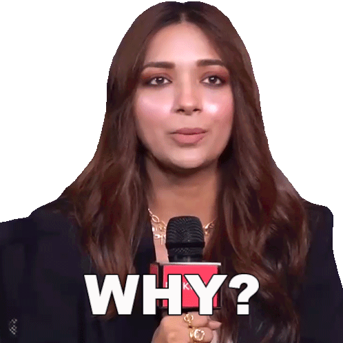 Jiya Shankar holds a microphone, asking 'WHY?' with a questioning expression.