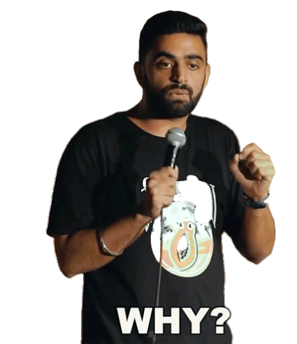 Comedian Rahul Dua holds a microphone, looking curious and asking 'Why?' with an expressive gesture.