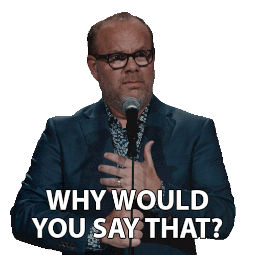 Comedian Tom Papa on stage, gesturing with his hand on his chest, asking "Why Would You Say That?" from his Netflix special.