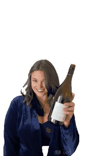 Kamini, a woman with long dark hair, smiles while holding up a large bottle of wine, ready to celebrate.