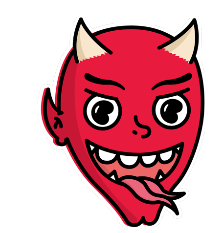 A playful red devil cartoon character, Dmont, winks mischievously while sticking out its tongue.