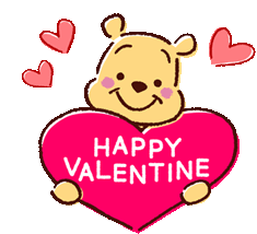 Winnie the Pooh holding a 'Happy Valentine' heart, surrounded by floating hearts, perfect for sharing love.