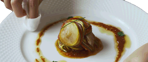 A hand meticulously wipes a white plate, showcasing a beautifully plated vegetable dish, likely ratatouille, from Two Plaid Aprons.