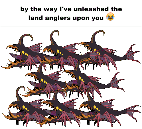 A swarm of pixelated land anglers from Wizard With A Gun are unleashed, accompanied by a laughing emoji.
