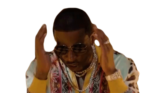 Gucci Mane reacts with a 'mind blown' expression, holding his head in disbelief, conveying shock and overwhelm.