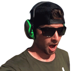 A man wearing sunglasses and headphones reacts with a wide-mouthed expression of shock and surprise.