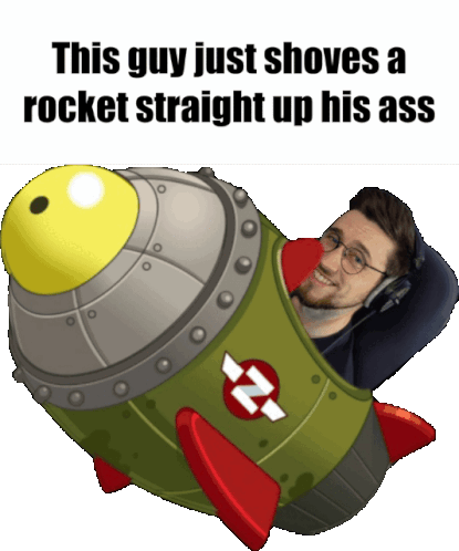 a man in a rocket with the words " this guy just shoves a rocket straight up his ass " above him