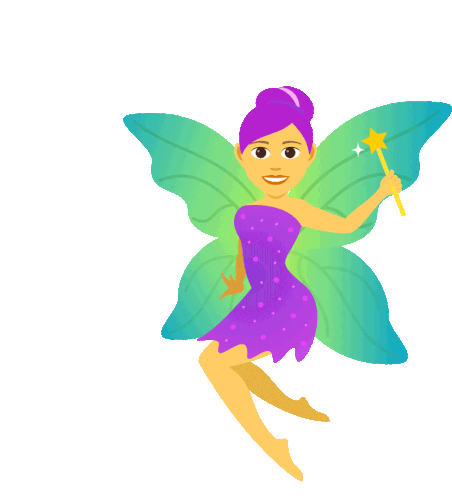 An animated Joypixels fairy with purple hair, teal wings, and a polka-dotted dress, happily floating with a magic wand.