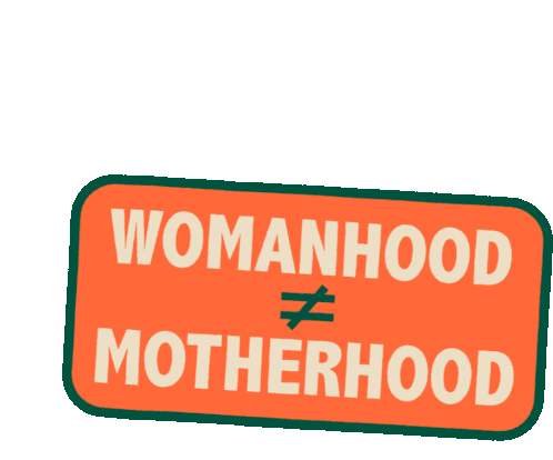 Animated sticker featuring the phrase 'Womanhood ≠ Motherhood' on an orange sign, symbolizing feminist ideals and reproductive freedom.