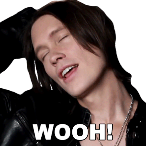 Pellek, with long dark hair and a leather jacket, exclaims 'WOOH!' with his eyes closed and mouth open.