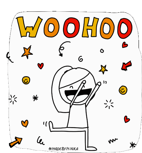 A joyful Madebyminka stick figure celebrates with an excited happy dance, surrounded by stars and hearts, exclaiming 'Woohoo!'