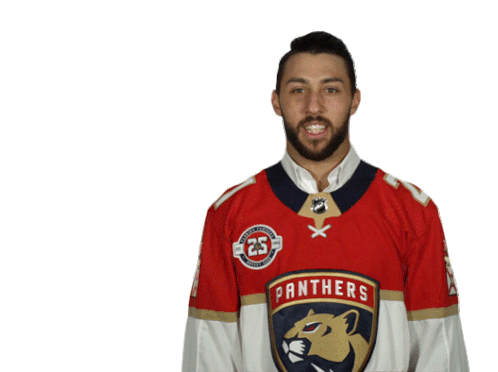Vincent Trocheck, wearing a Florida Panthers NHL jersey, cheers enthusiastically with fists raised in the air.
