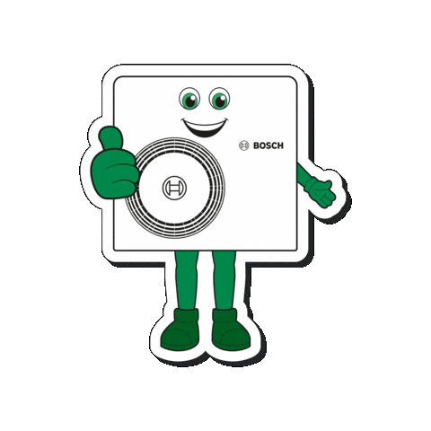 Harley the Worcester Bosch heat pump mascot gives a cheerful thumbs up, promoting efficiency and reliability.