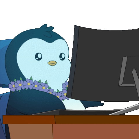 A cute animated penguin wearing a lei, diligently typing on a computer at an office desk.