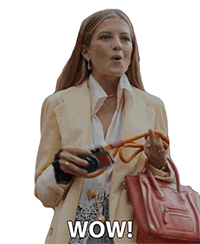 A woman with long hair, holding a camera and a red bag, expresses amazement with an open mouth and says 'wow!'