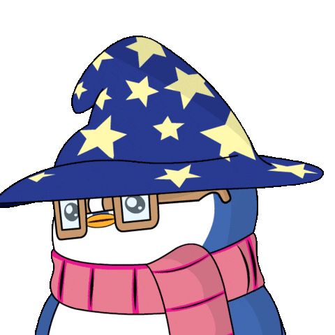 A Pudgy Penguin character, wearing a wizard hat, glasses, and scarf, looks utterly amazed and shocked.