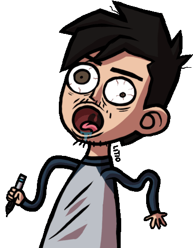 An animated character by litioo with wide, crazy eyes and a pen, depicting a writer's intense focus.