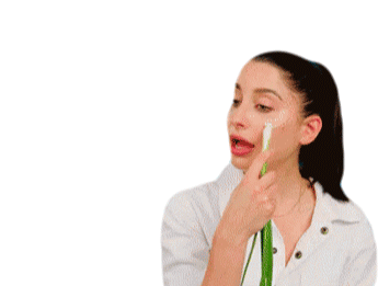 Elle applies a green plant stem to her face with a surprised and slightly disgusted expression, a unique skin care moment.