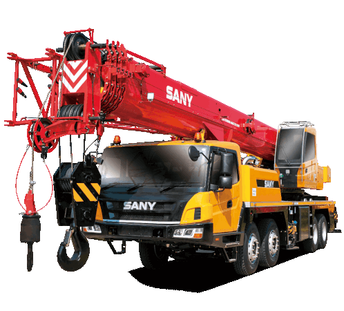 a red sany truck with a crane attached to it