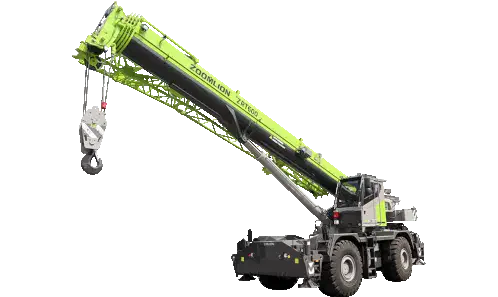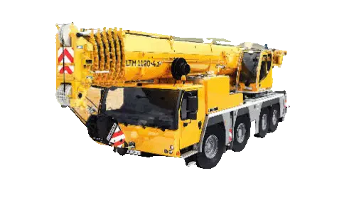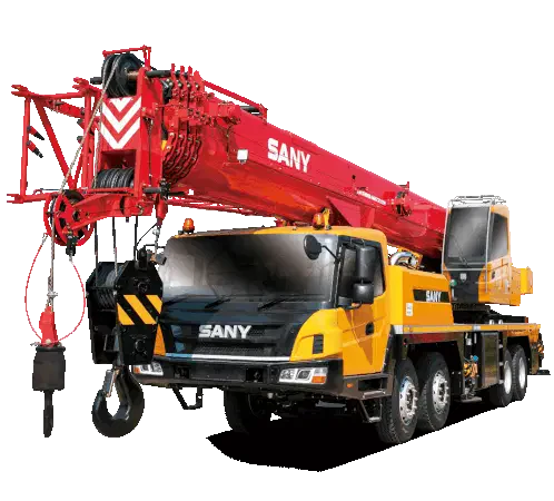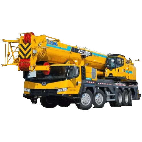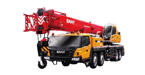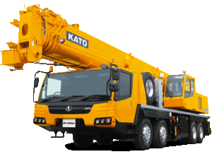 a yellow kato truck with a large crane attached to the back