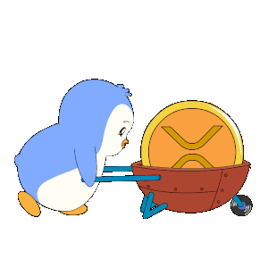 a penguin is pushing a wheelbarrow with a coin inside of it