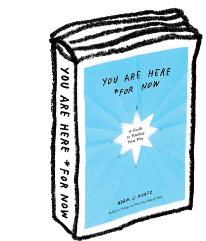An animated sticker of the book "You Are Here For Now" by Adam J. Kurtz, a guide for finding your way, promoting self-care.