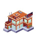 A collection of isometric pixel art buildings including an auto dealer, hospital, hotel, and shop, from Yakuza Land Yakuza Inc.