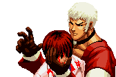 Yashiro Nanakase menacingly holds Kyo Kusanagi in this intense King of Fighters pixel art sticker, depicting a dramatic scene.