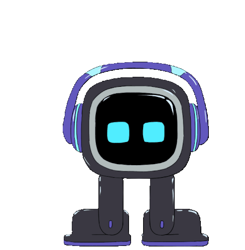 Emo, the cute robot, floats happily with headphones on, surrounded by colorful flowers and petals, spreading peaceful vibes.