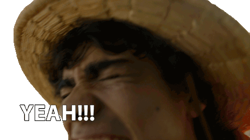 Monkey D. Luffy, portrayed by Iñaki Godoy, shouts 'Yeah!!!' with excitement, capturing his energetic spirit from One Piece.