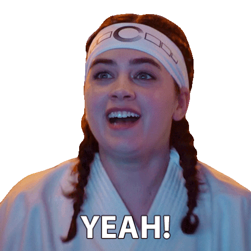Samantha LaRusso, played by Mary Mouser, enthusiastically exclaims "Yeah!" with a wide smile and a karate headband.