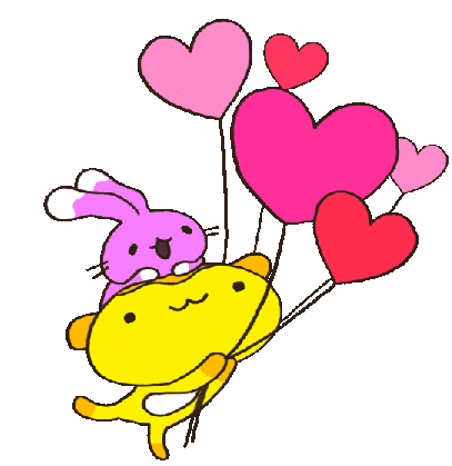 A cheerful yellow character and a purple bunny fly together, holding a bunch of vibrant heart-shaped balloons.