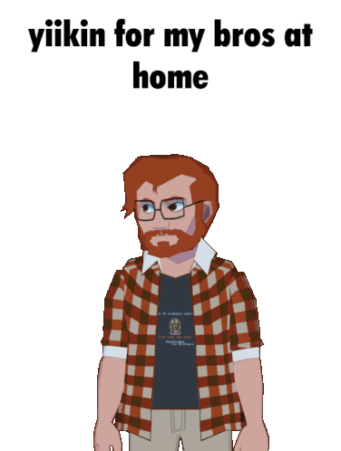 a cartoon of a man with glasses and a plaid shirt that says yiiikin for my bros at home
