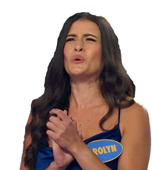 Carolyn from Family Feud Canada shows a classic 'yikes' reaction, clasping her hands in distress.
